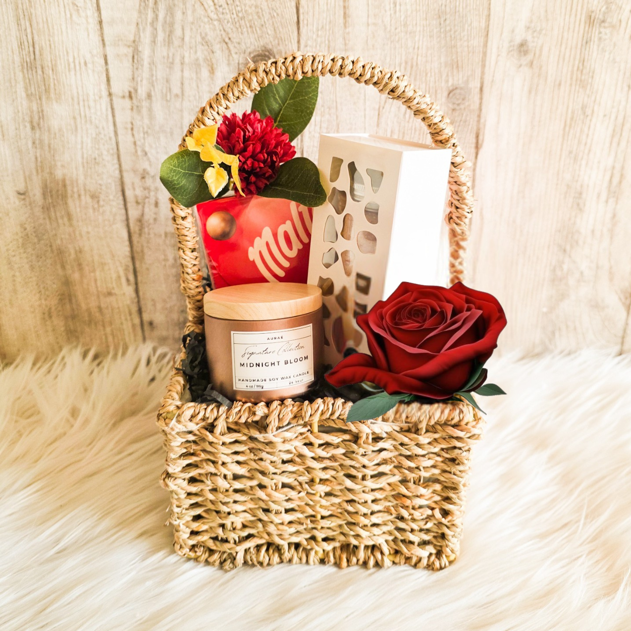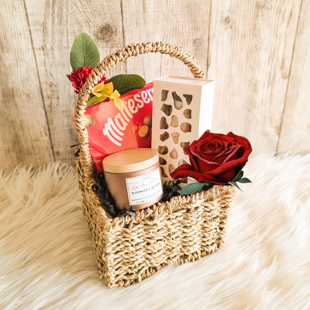 A sweet and thoughtfully curated Valentine’s gift basket designed for simple pleasures and heartfelt moments. Hearty Treats brings together indulgent chocolates, soothing self care, and romantic floral touches in a beautifully styled woven basket.