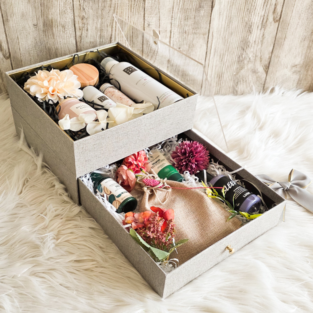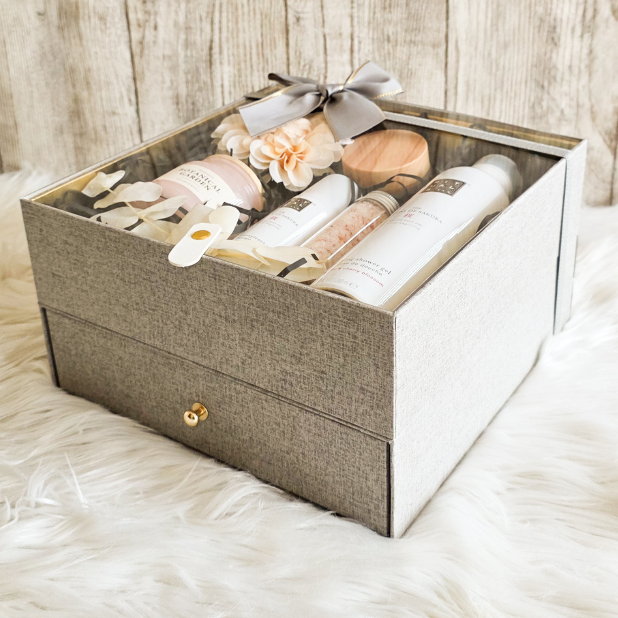 Beautifully arranged in a textured grey Chester drawer-style gift box with a transparent lid and satin bow, this hamper exudes understated luxury. Each item is nestled in premium filler and styled with florals for a polished finish.