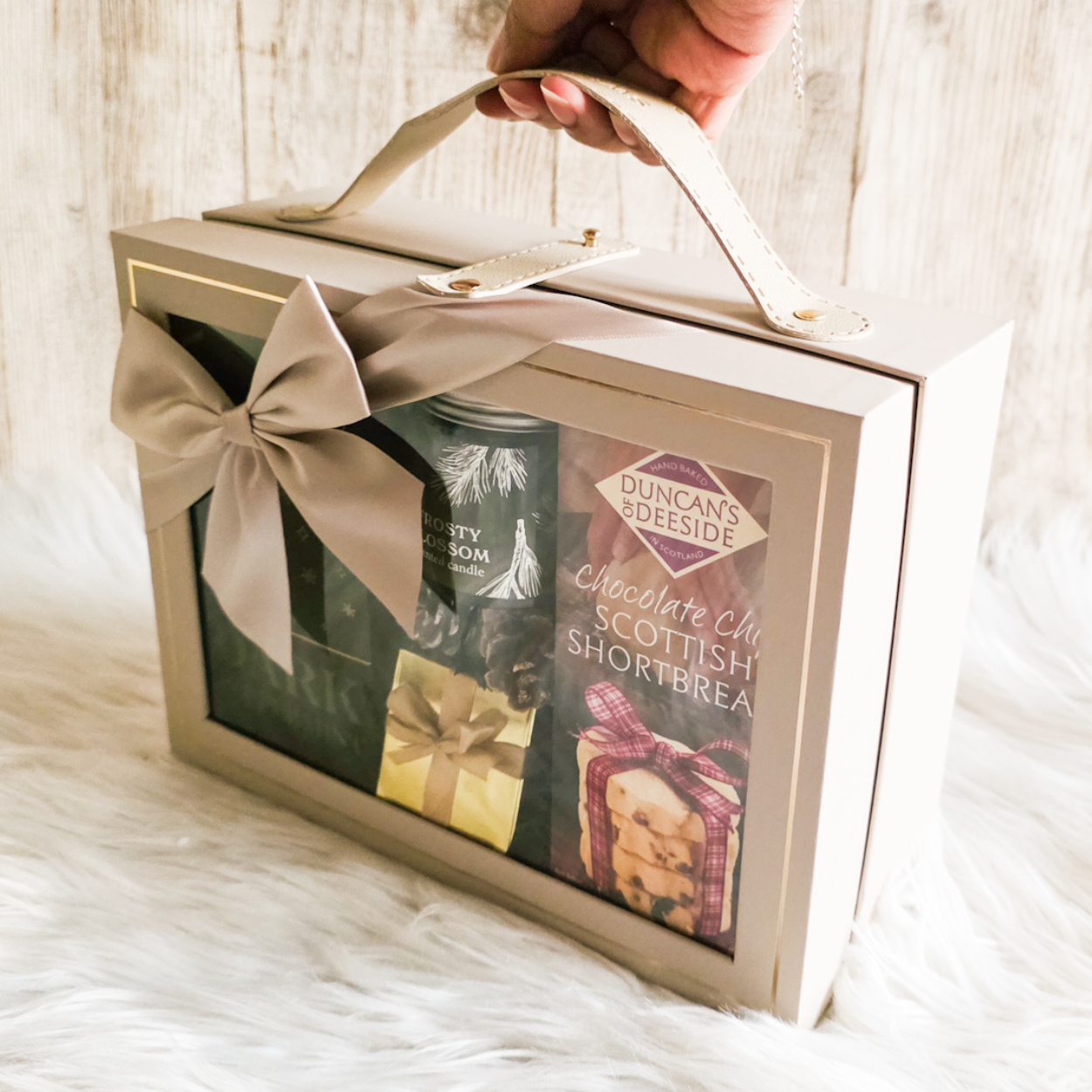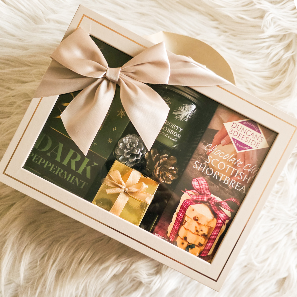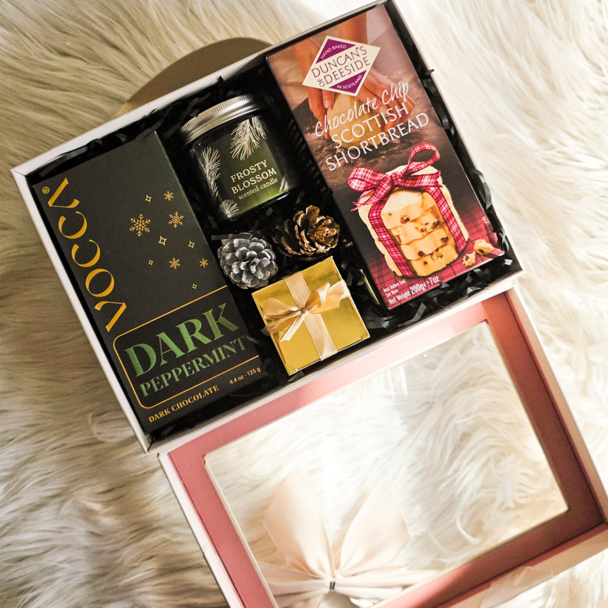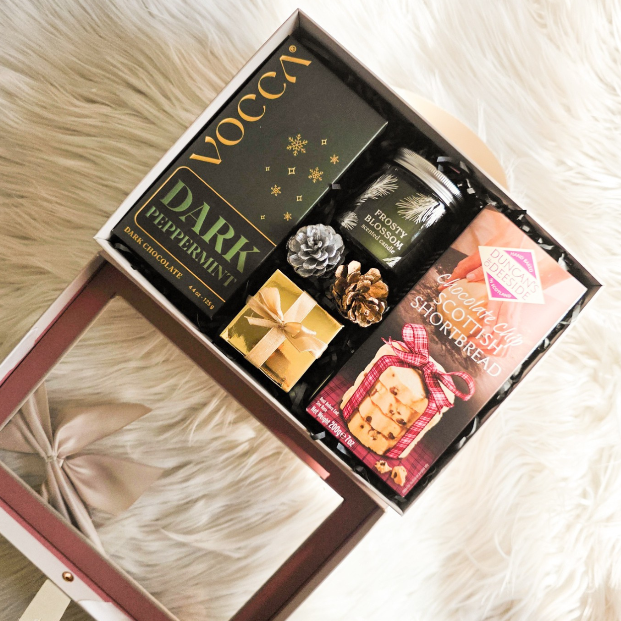 Arranged inside a luxury window gift box, finished with a satin ribbon and styled with black shredded filler and winter dƩcor.