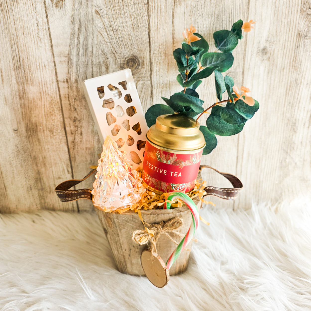 A natural wooden bucket-style basket with leather handles ā reusable, stylish, and perfectly seasonal.