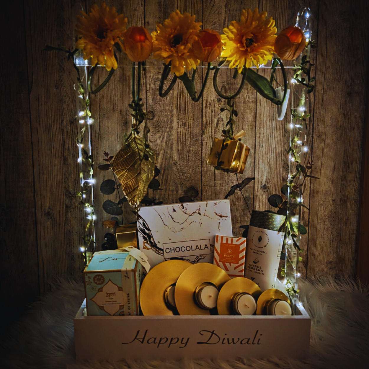 Expertly styled in a white “Happy Diwali” wooden box topped with a floral LED arch, this basket radiates festive beauty day or night. Each piece is carefully placed to create an elegant, photo-worthy centerpiece for homes or workplaces.