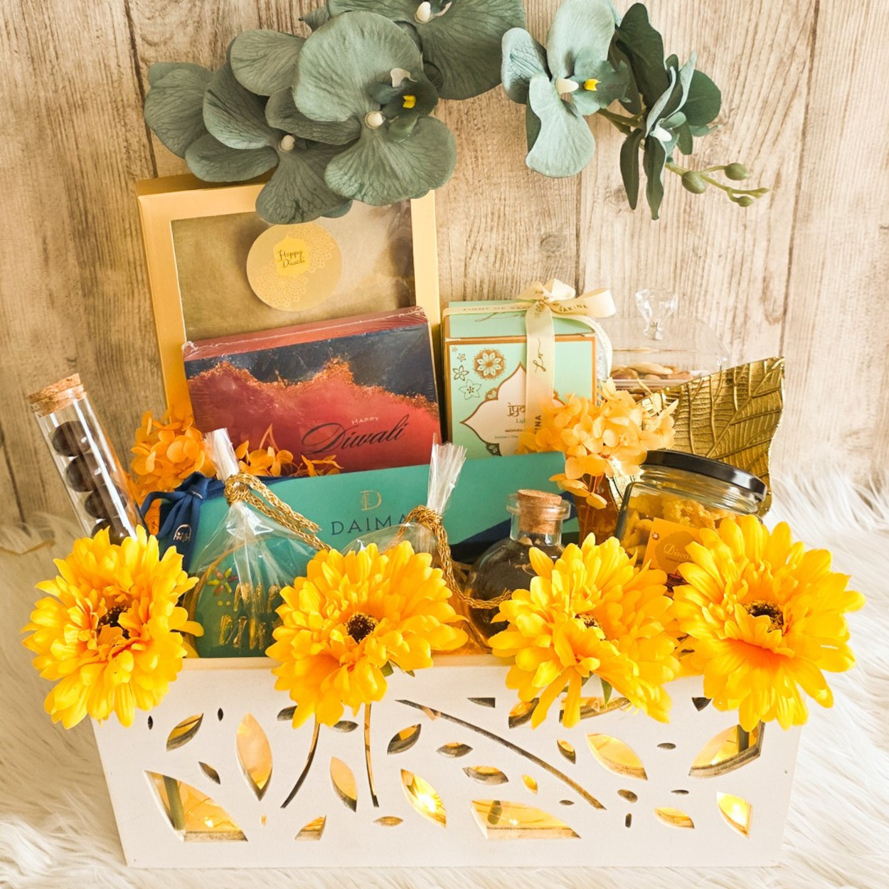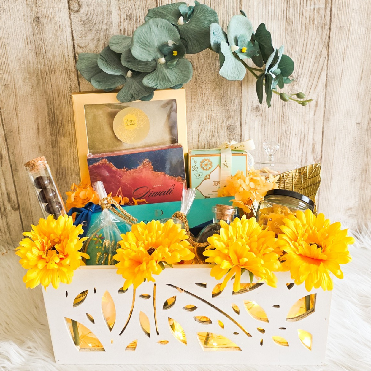 Celebrate the season of light and joy with this Happy Diwali Gift Hamper — a festive hamper filled with sweets, tea, chocolates, and scented candle. Thoughtfully packed in a stylish wood box with floral accents, this hamper brings together the perfect blend of tradition and indulgence.