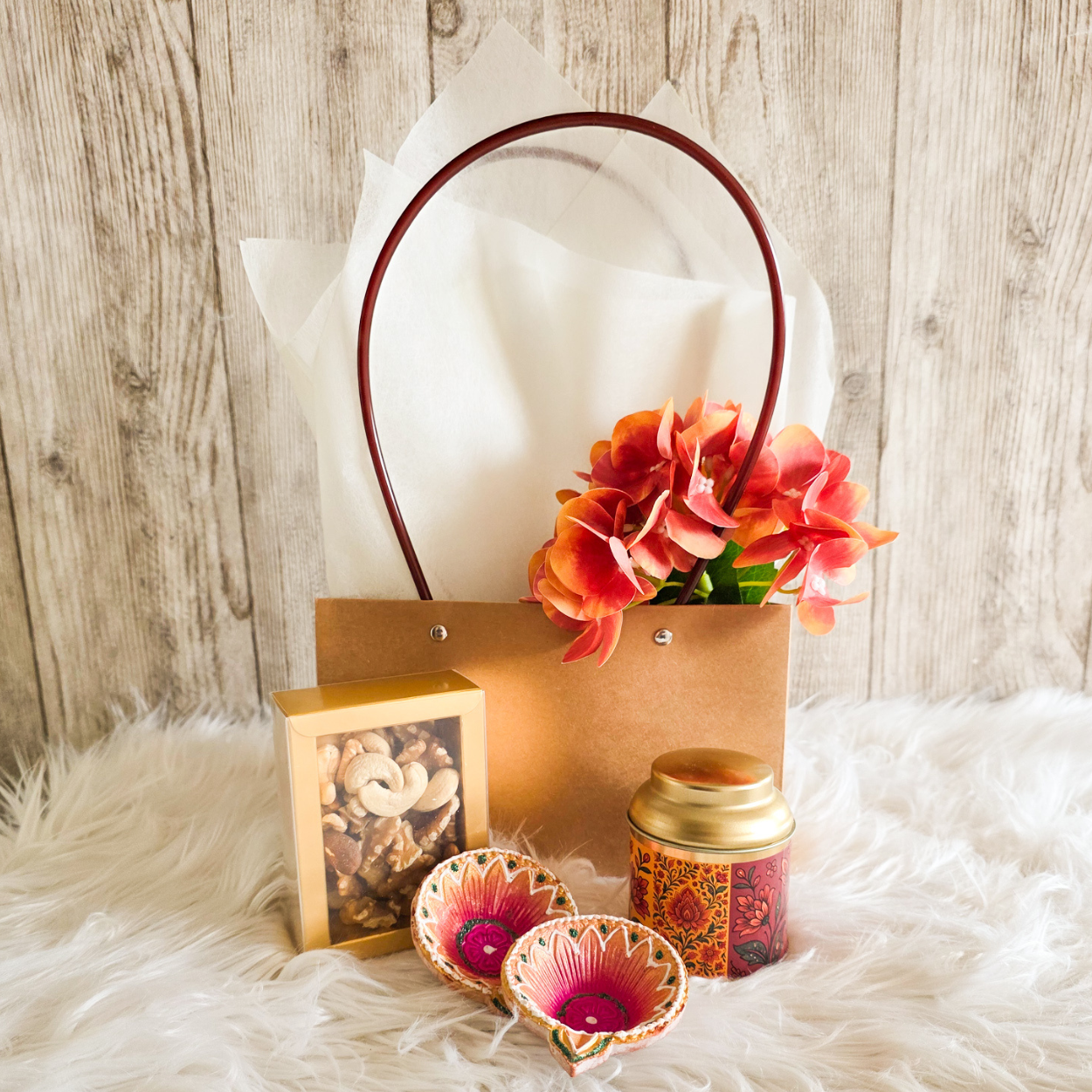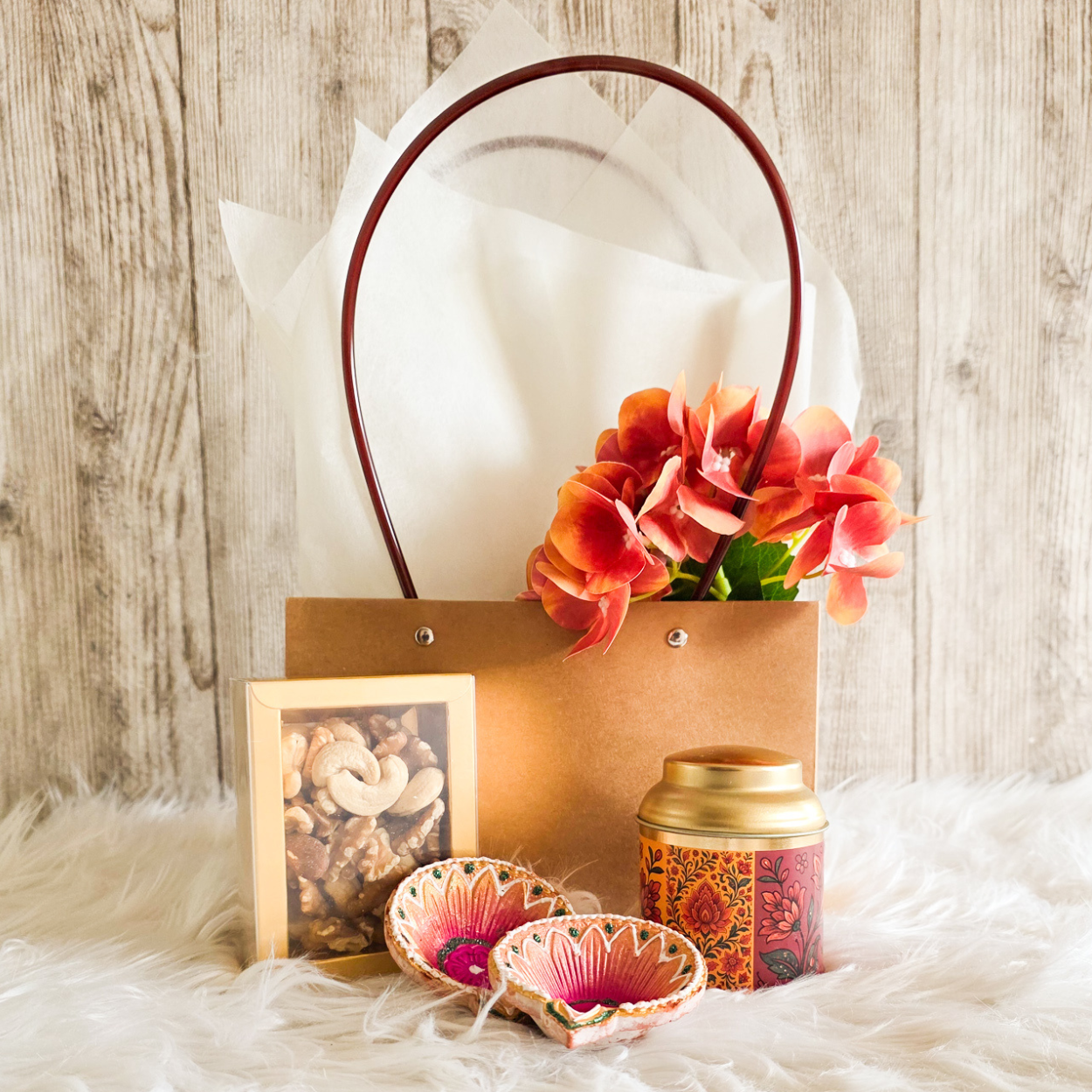 Presented in a chic kraft-style gift bag with sturdy handles, layered with tissue and adorned with florals for a graceful Diwali touch.