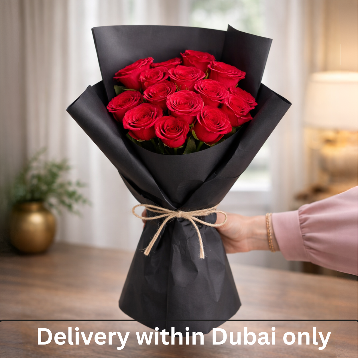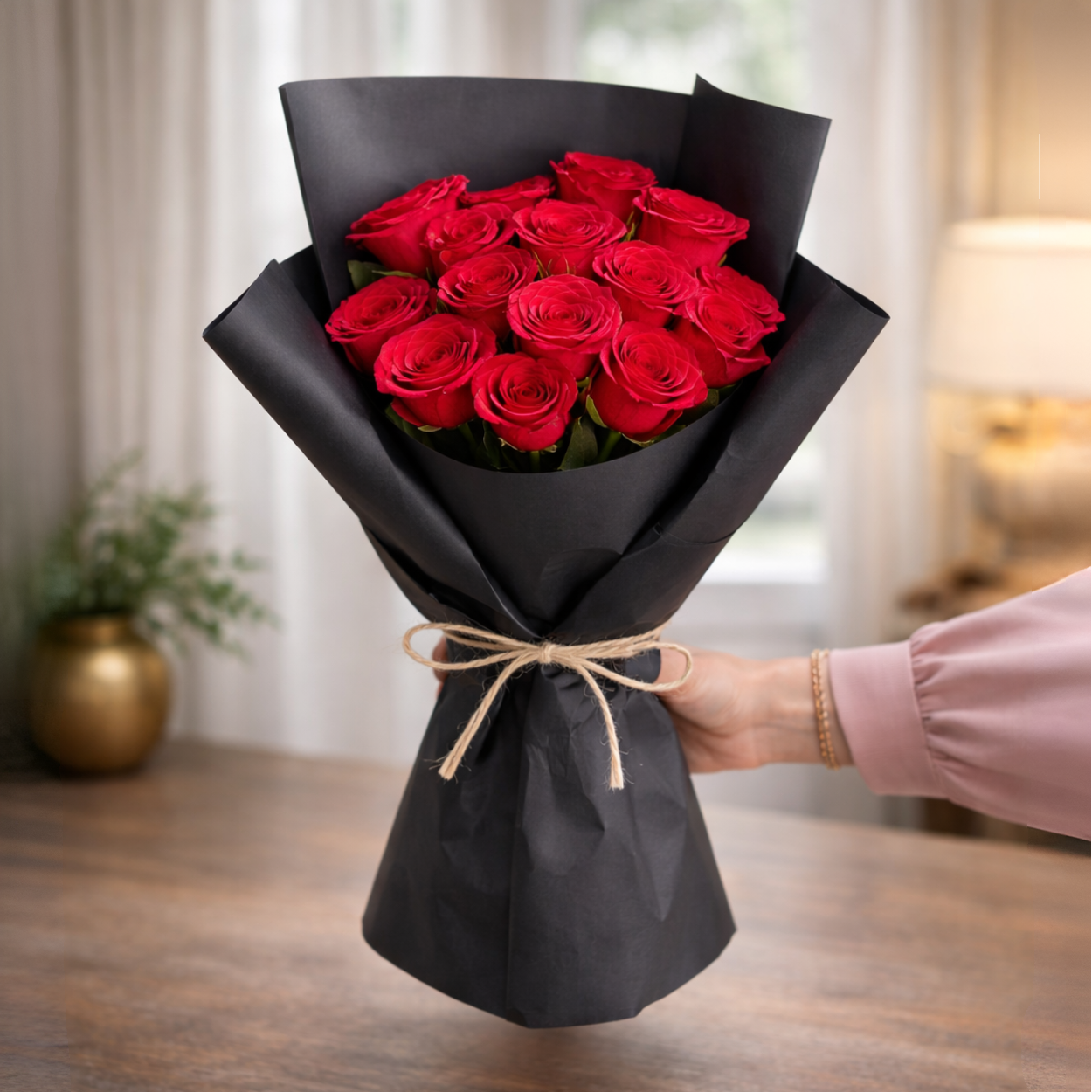 A timeless expression of love and elegance. This bouquet features 12 premium red roses, carefully hand-tied and wrapped in sleek black paper, finished with a natural twine bow for a modern, minimalist touch.