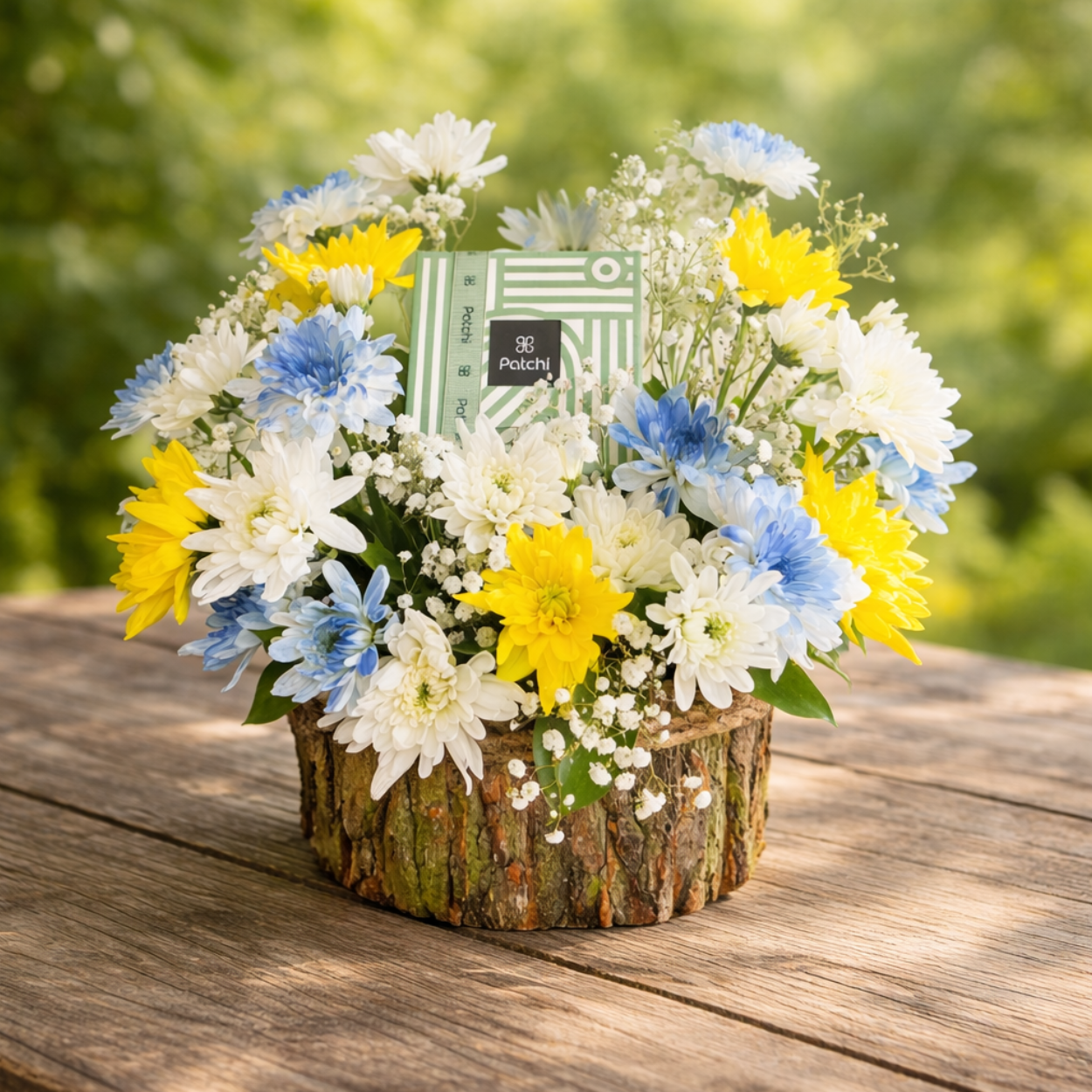 Gift Your Loved Ones A Fresh Flowers Arrangement Of Light Blue, Yellow & White Flowers With A 250gm Box Of Patchi Chocolates.