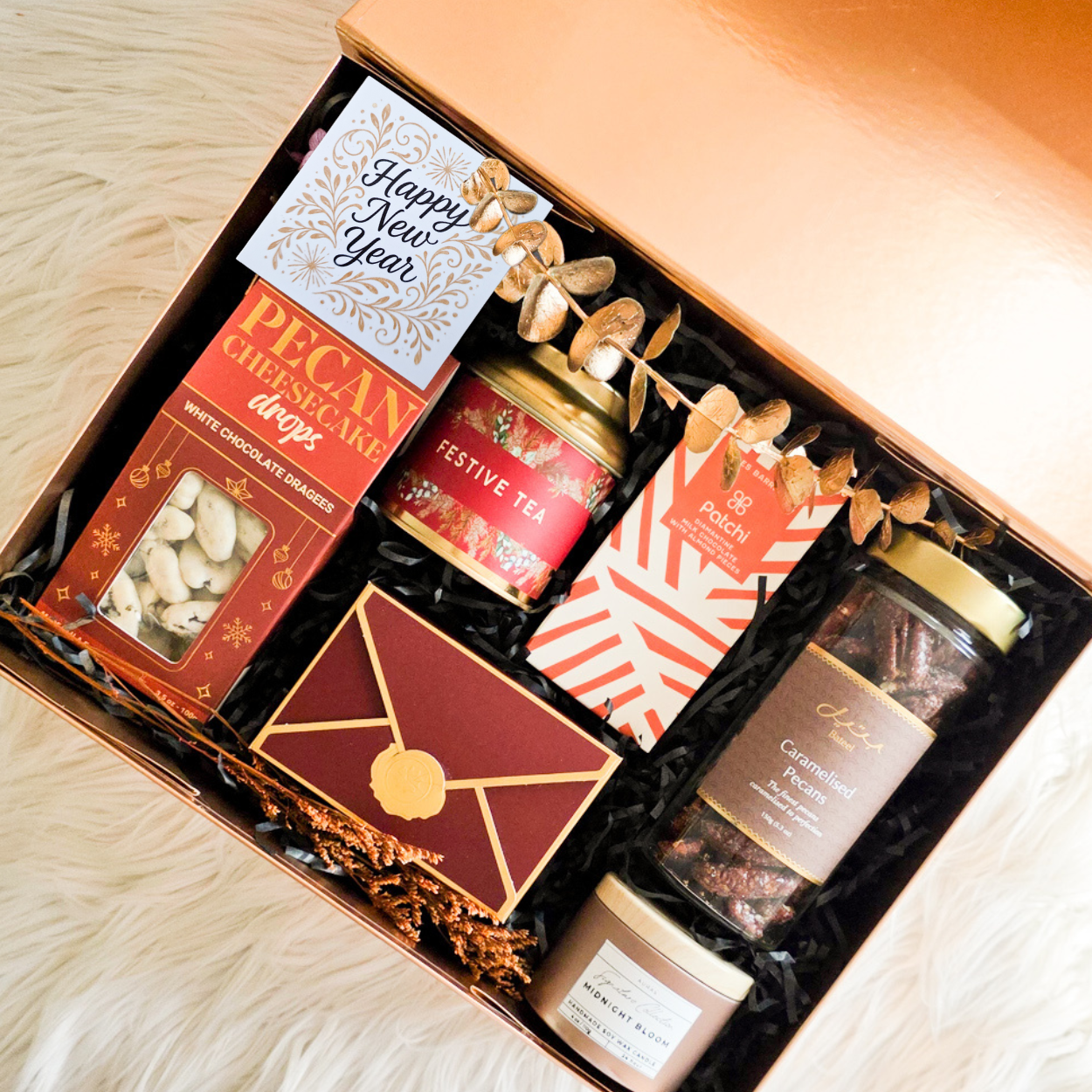 A charming, elegant, and truly luxurious festive surprise - New Year Gift Box brings together gourmet delights, winter warmth, and premium treats beautifully arranged in a stunning rose-gold gift box. Designed to impress at first sight, this hamper is perfect for family, friends, colleagues, or anyone deserving of a little Christmas magic.