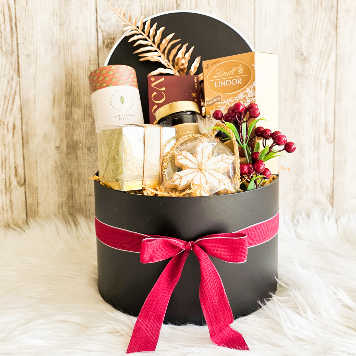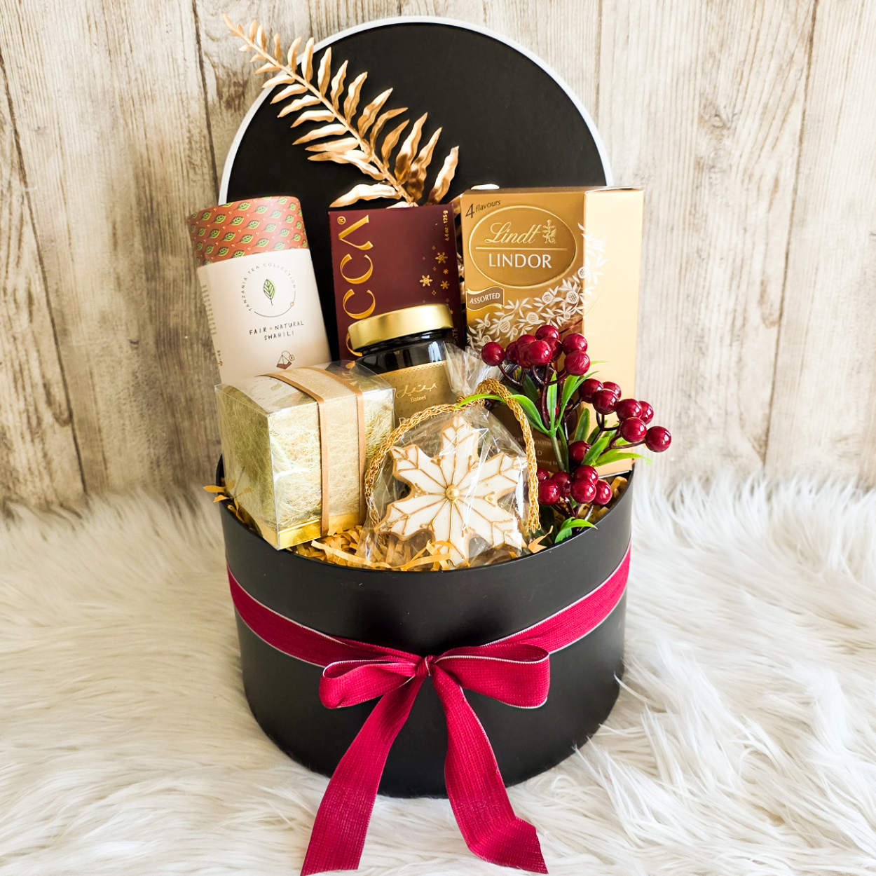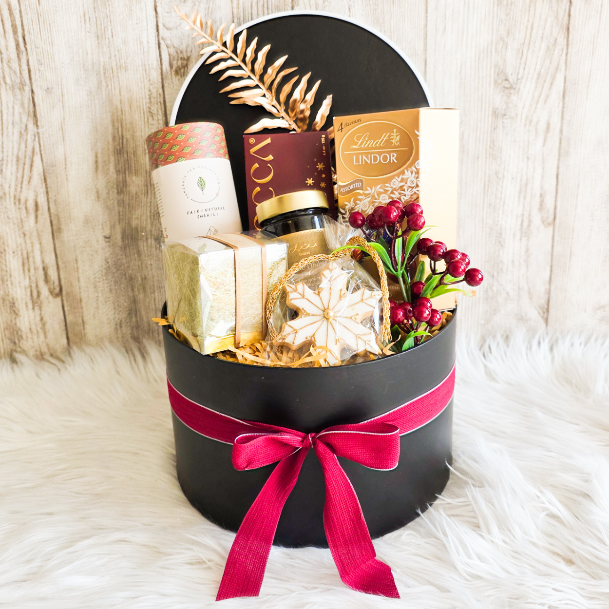 All items are arranged in a premium black hatbox, finished with a deep red bow and festive embellishments. Elegant, modern, and gift-ready. Final wrapping in clear plastic ensures it’s gift-ready for the occasion.